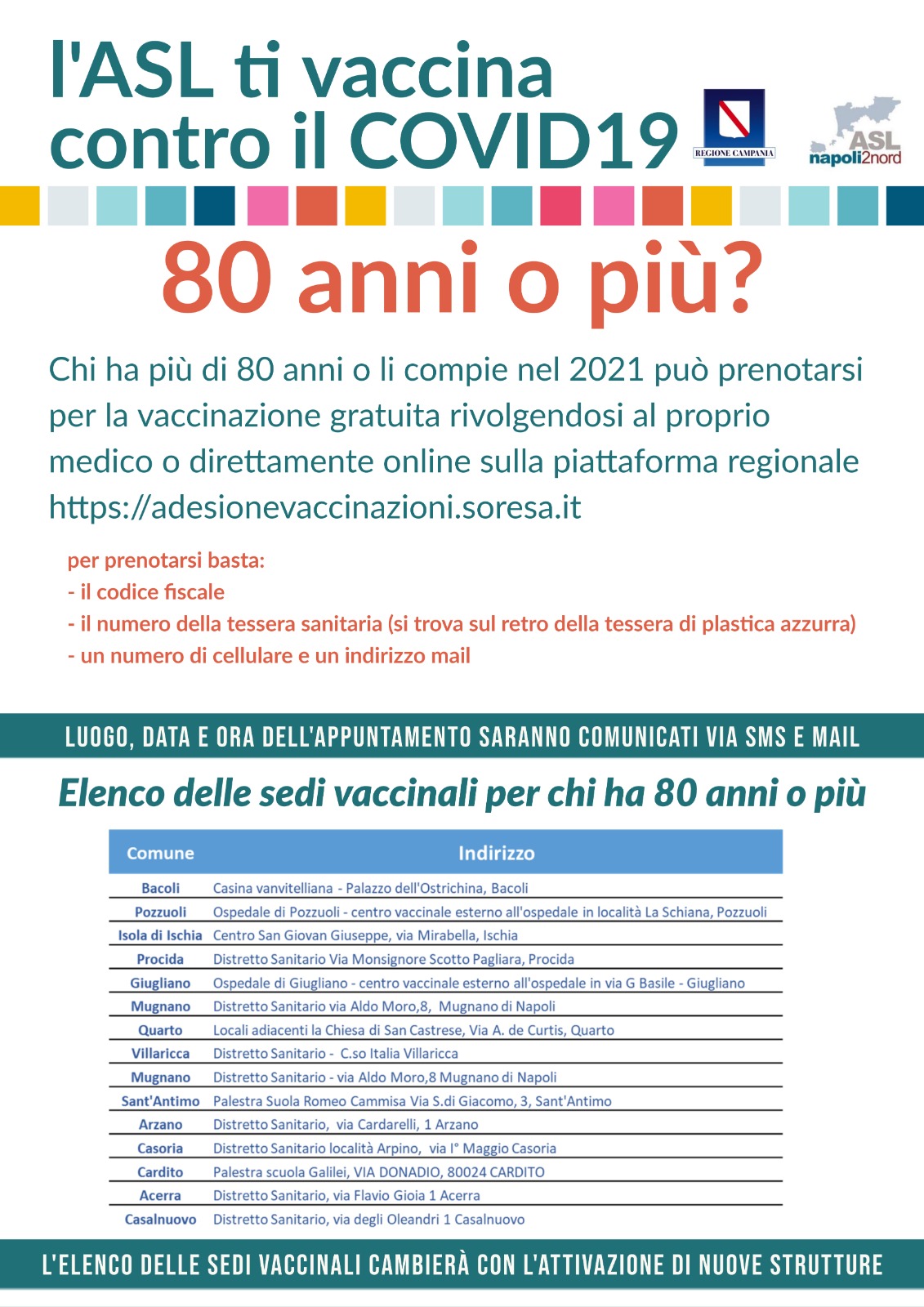 Dichiarazione del Sindaco Antonio Sabino: “Con grande soddisfazione comunico alla città che venerdì mattina alle 9.30 daremo inizio alle attività di vaccinazione anti-COVID per i primi 60 ultraottantenni di Quarto. Grazie alla sinergia istituzionale tra il nostro Ente, la direzione generale dell’Asl Napoli 2 Nord e la Regione Campania abbiamo chiesto e ottenuto che il punto vaccinale fosse a Quarto, evitando in questo modo ai nostri concittadini di doversi spostare per vaccinarsi. Le attività si faranno, infatti, nei locali adiacenti la sede della Protezione civile comunale nel complesso della Parrocchia San Castrese, in via Antonio de Curtis. Una struttura facilmente raggiungibile, che garantisce anche spazi ampi per evitare il rischio di assembramenti. È il mio ringrazio personale e a nome della città va anche al nostro Vescovo, monsignor Gennaro Pascarella e a don Giuliano, parroco della chiesa San Castrese per la proficua sinergia per il bene collettivo”.