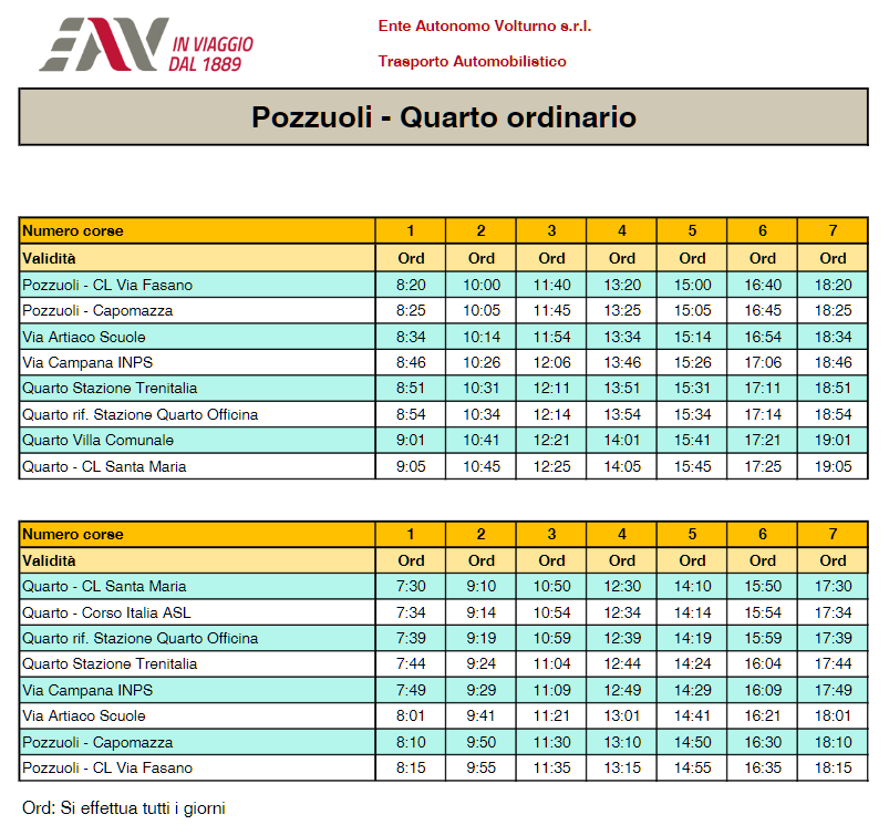 L'E.A.V. (Ente Autonomo Volturno) ha comunicato che è stato ripristinato il servizio autobus ex CTP che collega Quarto con Pozzuoli.