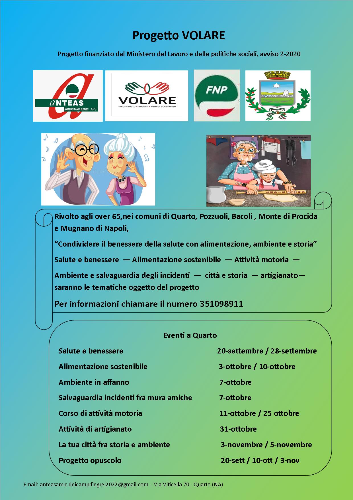 L’associazione ANTEAS AMICI DEI CAMPI FLEGREI APS svolge prevalentemente attività in questo territorio con i ragazzi e le loro famiglie ed è conosciuta per la professionalità dei propri soci nelle attività che svolgono: dalla scienza della nutrizione, alla psicologia, all’ambiente; dal teatro all’archeologia, dalla tutela delle donne al bullismo.