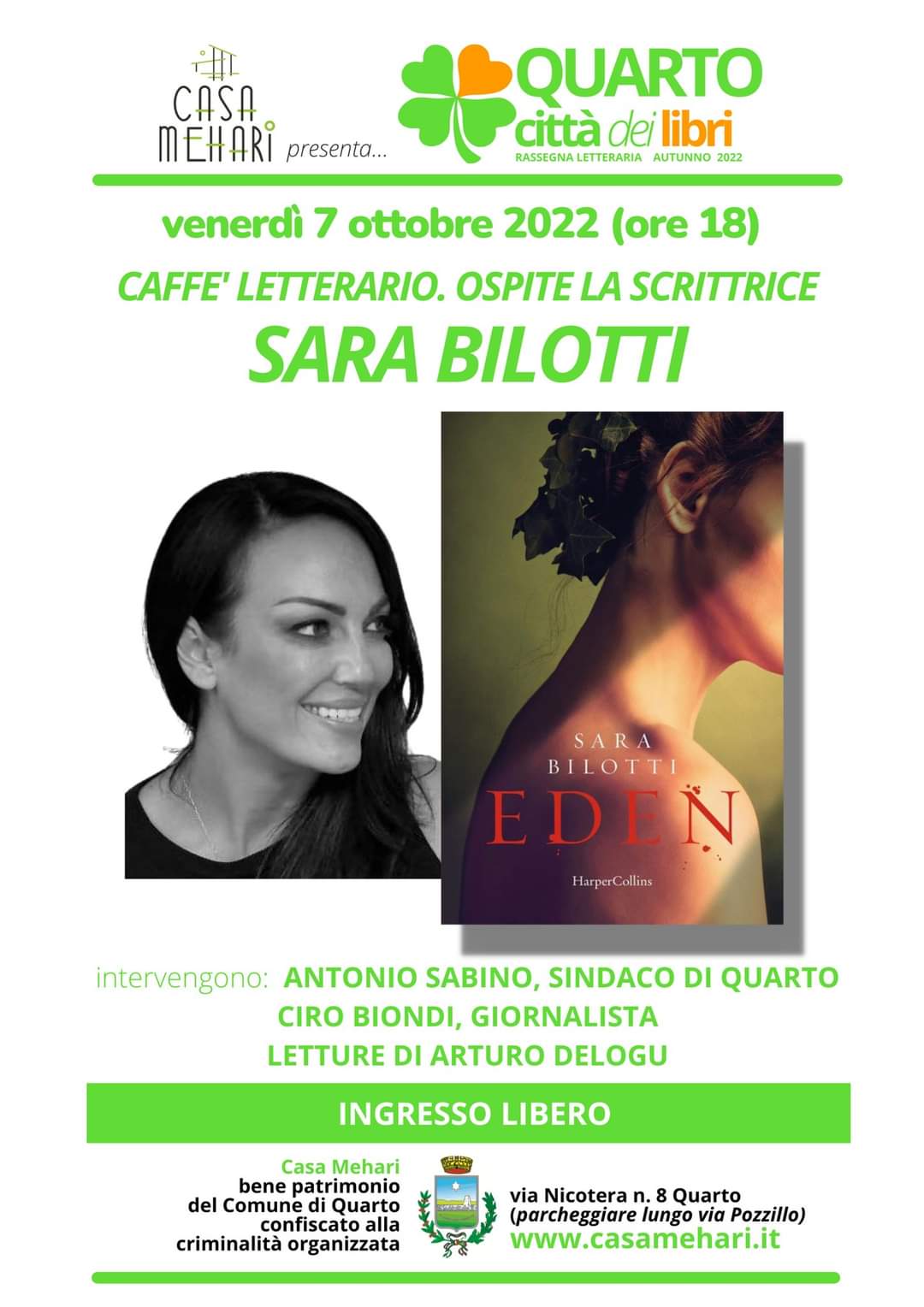Sara Bilotti presenterà il thriller "Eden", edito da HarperCollins. L'autrice è residente a Quarto ed è considerata la maestra del thriller psicologico in Italia. È diplomata in danza classica e ha compiuto studi filologici e letterari. Nel 2012 ha pubblicato "Nella Carne", una raccolta di racconti neri per Termidoro Editore. "L'oltraggio" (Einaudi Stile Libero 2015) è invece il suo romanzo d'esordio, primo di una trilogia erotica, a cui seguono "La colpa" e "Il perdono". Nel 2018 ha pubblicato con Mondadori il romanzo thriller "I giorni dell'ombra".