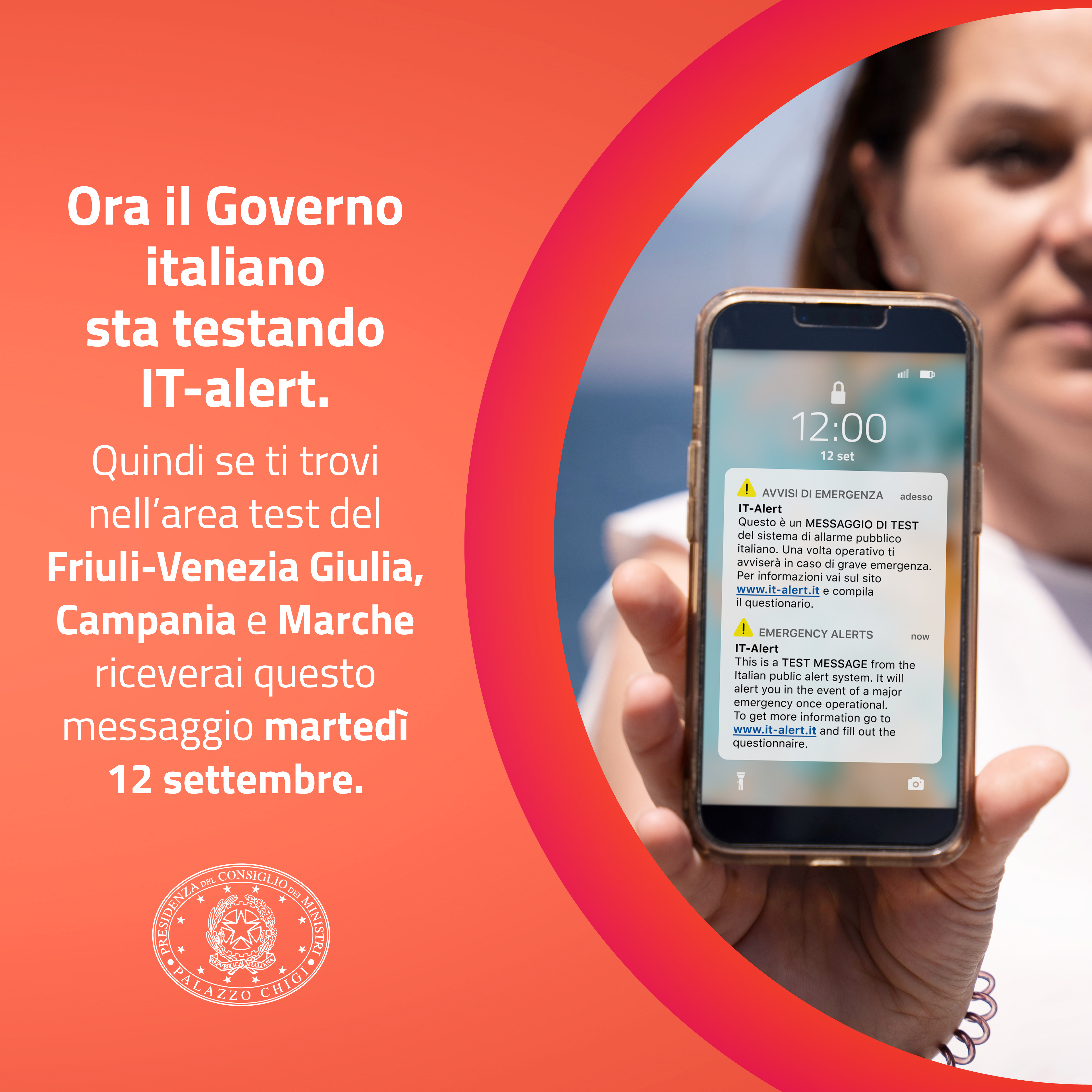 Il test del giorno 12 servirà esclusivamente a far conoscere IT-alert come nuovo ed aggiuntivo sistema di allarme pubblico che, in caso di gravi emergenze dei tipi sopra indicati, potrebbe raggiungere i cittadini nei territori interessati.