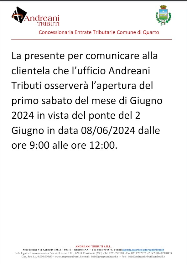 Comunicazione differimento di apertura sportello dell'agenzia Andreani Tributi del primo sabato mese di giugno 2024