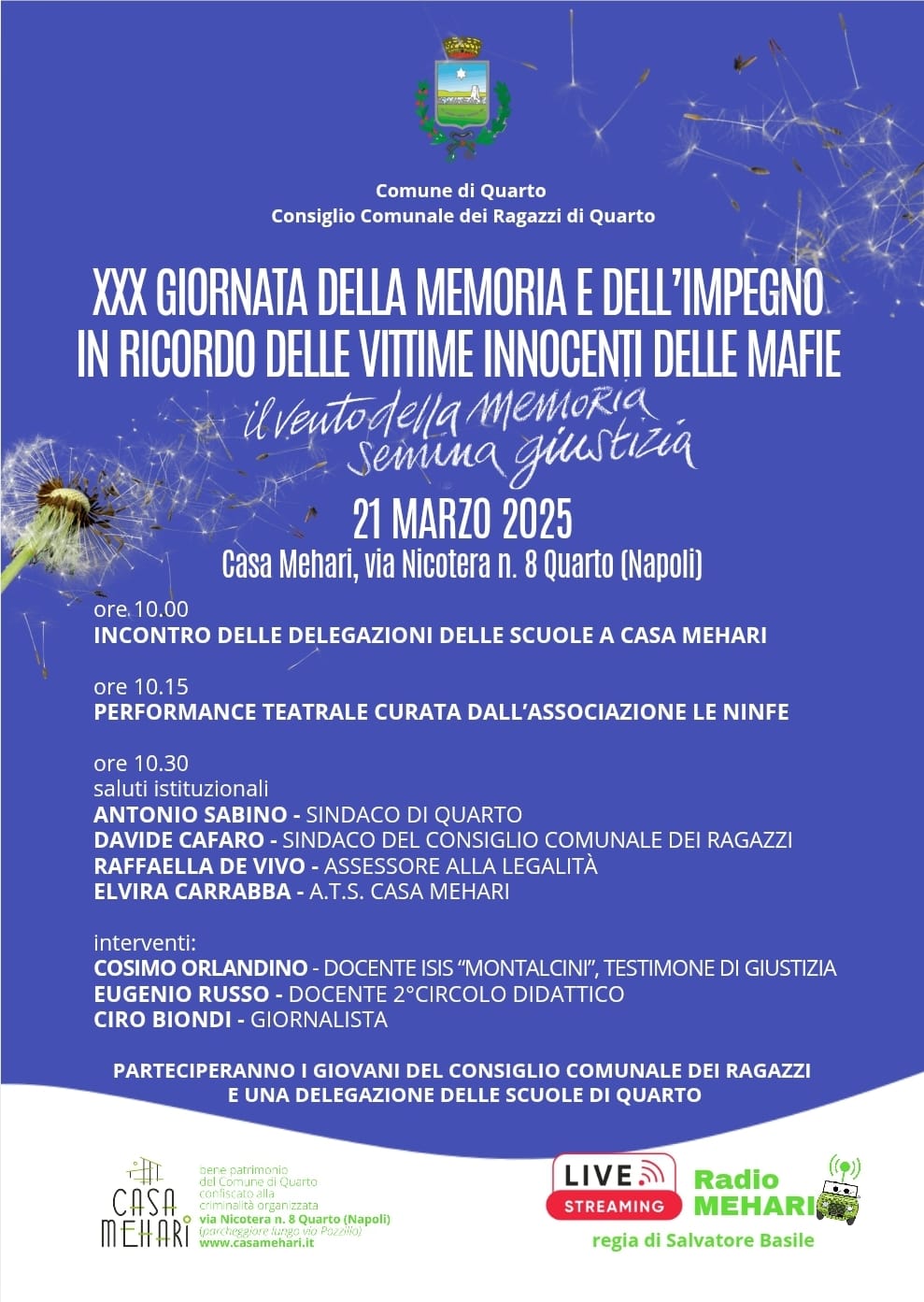 XXX giornata della memoria e dell'impegno in ricordo delle vittime innocenti delle mafie - 21 marzo 2025, incontro Casa Mehari, Via Nicotera n.8 Quarto (Napoli)