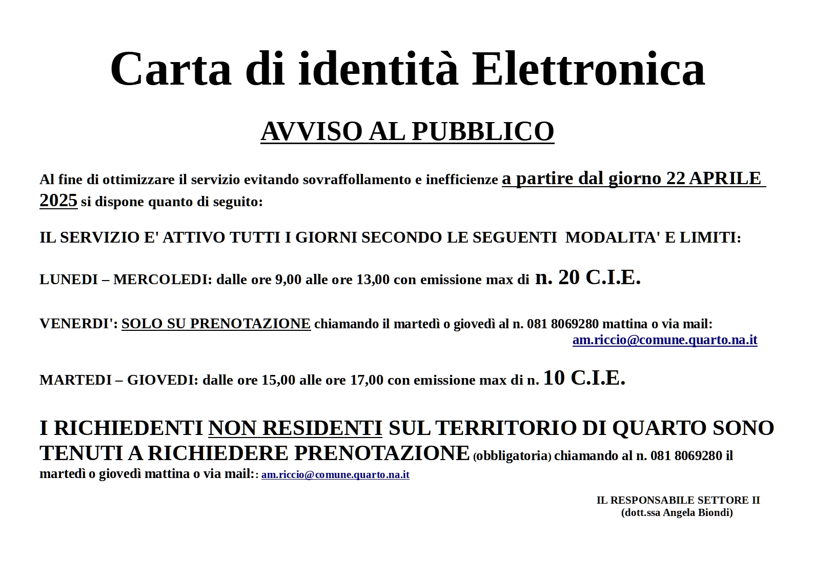 Modalità di servizio al pubblico dell'Ufficio Carta di identità elettronica (C.I.E.)