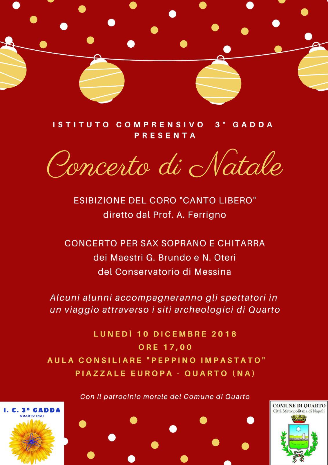 Il Sindaco e l'Amministrazione comunale annunciano alla cittadinanza che lunedì 10 dicembre 2018, alle ore 17.00, nell'aula consiliare del Comune di Quarto "Peppino Impastato, Piazzale Europa, l'Istituto comprensivo 3o Gadda ha organizzato, con il patrocinio del Comune di Quarto, il Concerto di Natale, ove si esibirà il coro "Canto Libero", diretto dal Prof. A. Ferrigno.