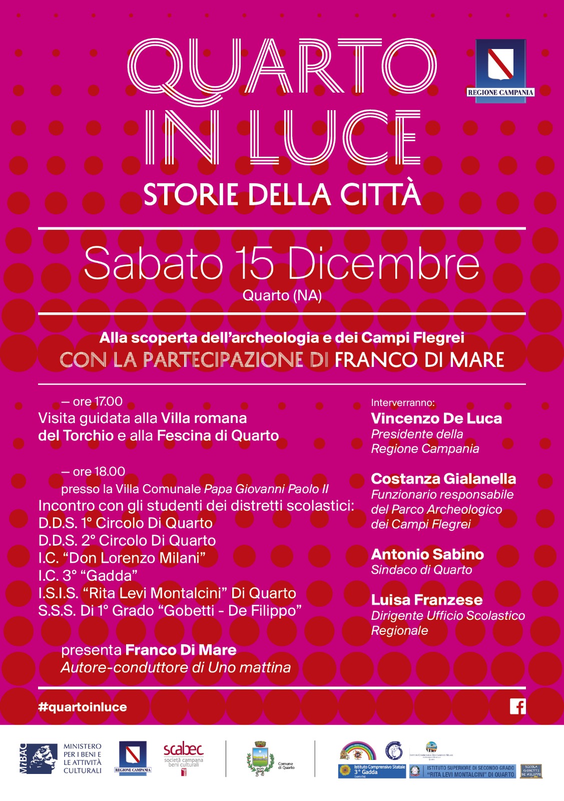 "Quest'anno il Natale a Quarto si illumina con tante iniziative di valorizzazione e promozione del territorio, nel segno della cultura, della musica di qualità, della valorizzazione dei beni archeologici. Una serie di eventi dedicati ai cittadini e alle cittadine di Quarto e alle loro famiglie, che vedranno protagonisti anche le scuole del territorio. A cominciare dall'evento di sabato a partire dalle ore 18 nel piazzale antistante la Villa Comunale, con il giornalista Rai Franco Di Mare che dialoghera' con i nostri studenti e con il governatore Vincenzo De Luca, per festeggiare anche i 70 anni dell'autonomia comunale di Quarto.